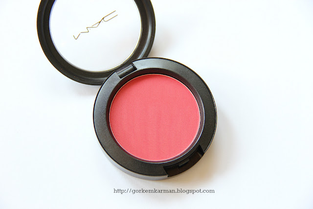 It's not hard to describe the color; a deep red, real red. I even read some blog posts, claiming that it's a deeper and sharper red than NARS Exhibit A. Anyways, I didn't end up looking cakey or powdery. I don't know if it's about the brush, the foundation underneath or the pigmentation of the blush, but I thought I would look very matte and powdery, since it happens with most of matte MAC blushers.
