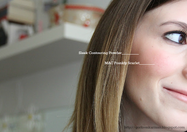 Günaydın! Bu yazıyı okuyan, okumayan herkese iyi Pazarlar! Bugünkü konuğum, geçen hafta yine daha fazla direnemeyip aldığım ürünlerden biri olan MAC Frankly Scarlet allığım olacak. Tamamen mat,ışıltısız ve aşırı, hatta biraz fazla aşırı pigmentli bu kırmızı allık, çok canlı ve korkutucu görünse de, tenle birleştiğinde ve tabii ki doğru fırçayla uygulandığında inanılmaz tatlı bir görüntü veriyor.
